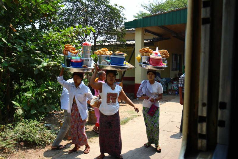 各駅には物売りが居て、女性は皆「タナカ」と呼ばれる化粧を頬に塗っていました。